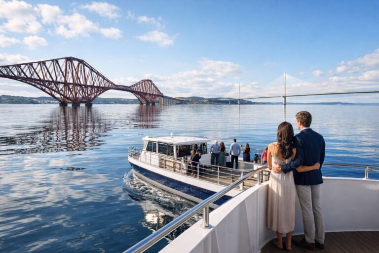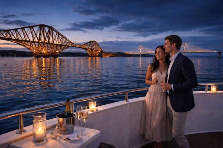 A romantic evening cruise across the Firth of Forth offers one of Scotland’s most cinematic proposal settings. With sweeping water views, glowing sunsets, and the iconic Forth Bridges as your backdrop, this experience combines movement, scenery, and emotional momentum in one elegant package.