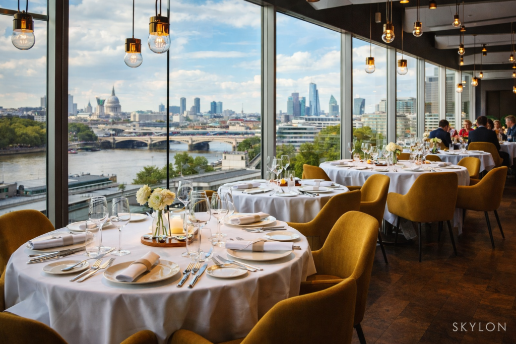Located within the Royal Festival Hall on London’s Southbank, Skylon offers one of the most elegant riverside dining settings in the city. With floor-to-ceiling glass windows overlooking the Thames, it delivers romance that feels polished, modern, and effortlessly impressive.